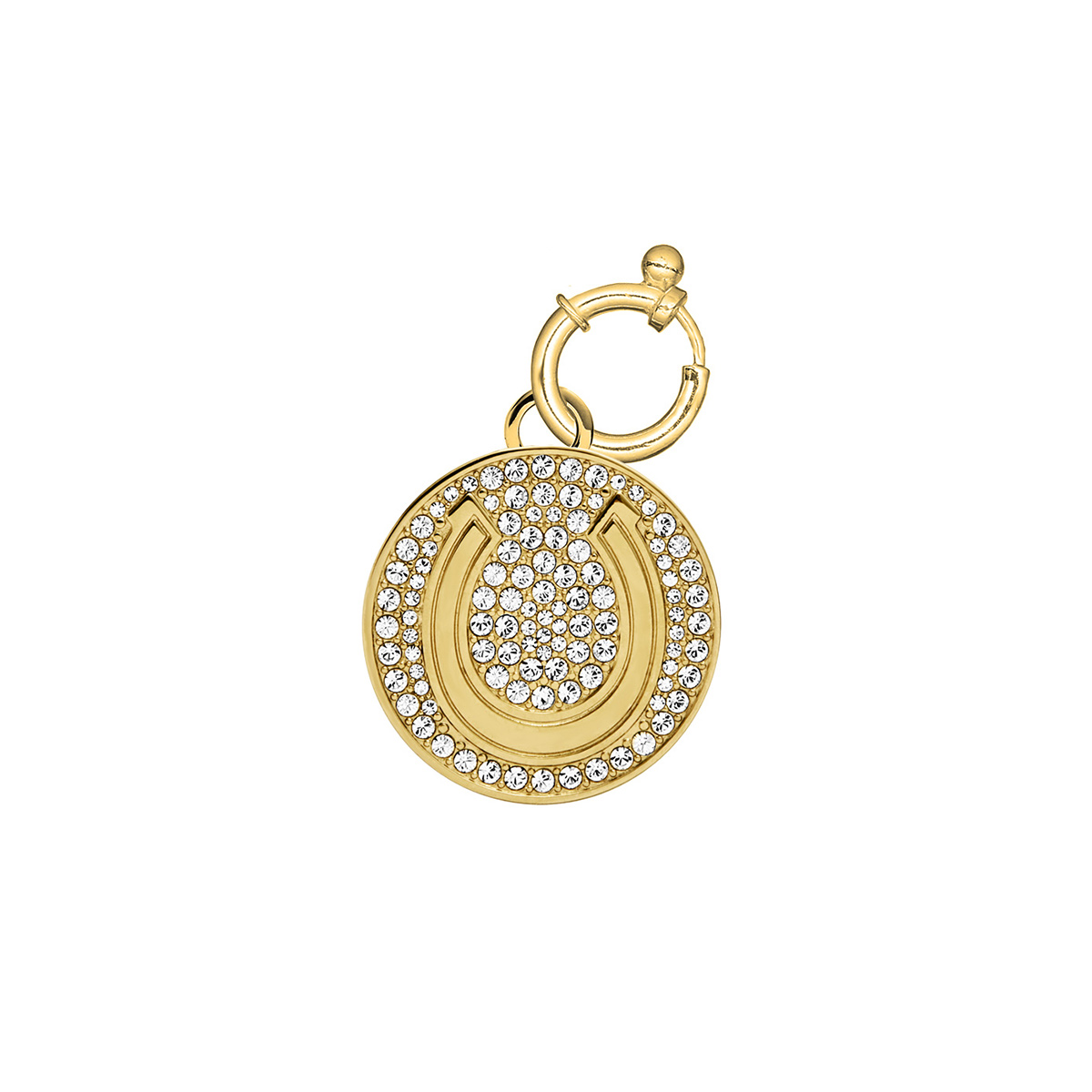 Urläcker berlock av rostfritt stål med 18K guldplätering och massor av gnistrande klara Swarovskikristaller. Berlocken har en symbol för tur, en hästsko, på framsidan och texten: LUCK på baksidan. Berlocken kommer med ett fjäderlås och kan hängas på en kedja eller snodd som halssmycke eller fästas på till exempel en väska som dekor.