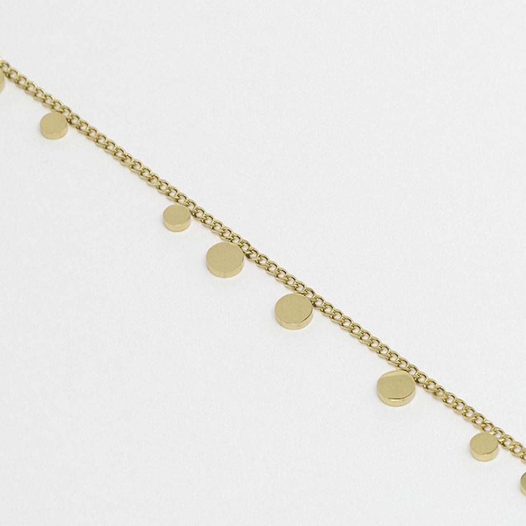 Kedjearmband i rent stål eller förgylld med fint guld på vilka metallmedaljonger är fästa som små konfetti. Detta armband är vackert i sig själv men kan blandas med andra armband från våra kollektioner. Finns också som halsband. Längd: 15 cm och 3 cm justering