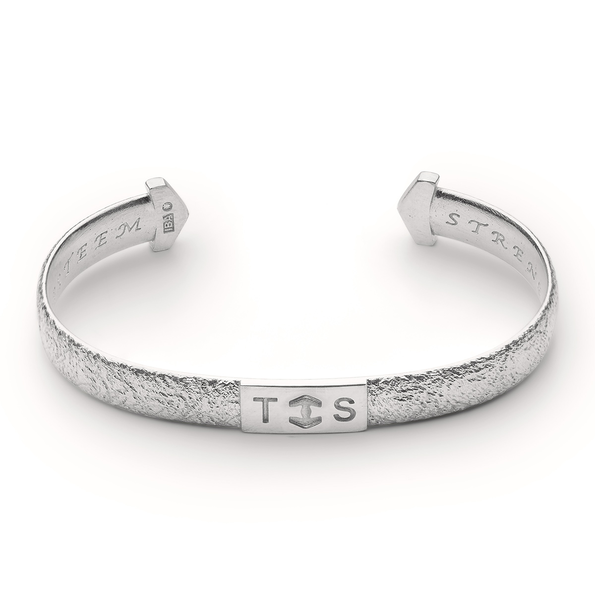 Sofistikerat stelt unisexarmband med dekor i relief som kontrasterar snyggt mot de blanka torshammarna i ändarna. På insidan har texten ”Strength, Determination & Self-Esteem” graverats in. På ovansidan står initialerna T (för TREEM) och S (för STHLM) på varsin sida om en liten dubbelhammare. Armbandet är tillverkat i Sverige av återvunnet sterling silver 935. 935 har en högre grad av rent silver men TREEM använder stämpeln 925 då den är mer välkänd. Armbandet levereras i smyckepåse och presentask.