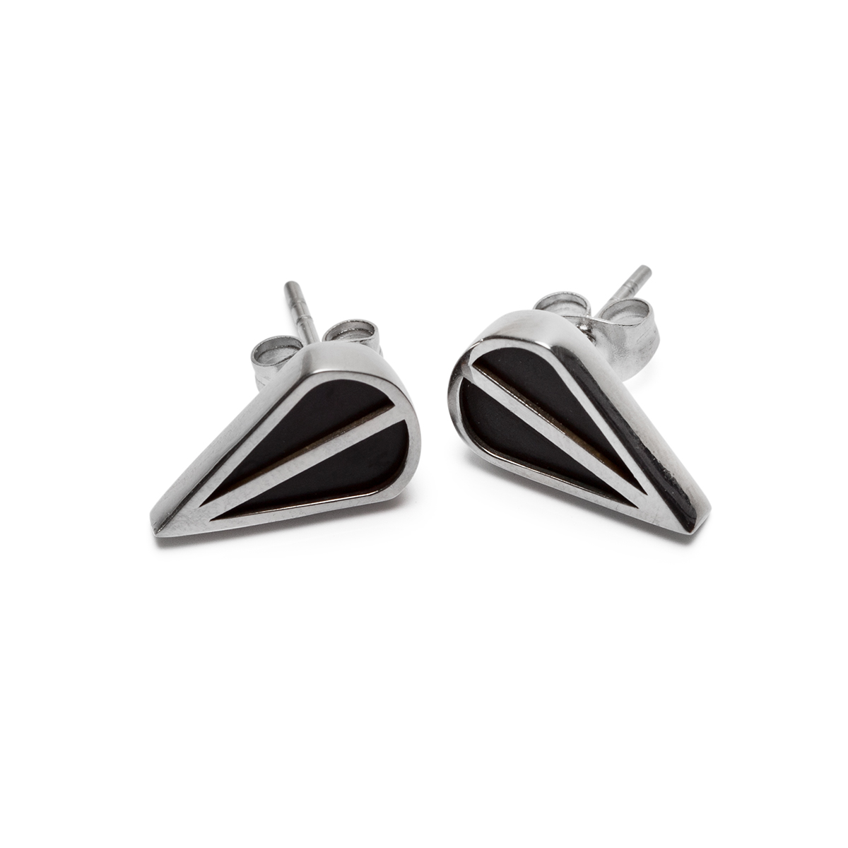 Moderna, stilrena droppformade stiftörhängen i rostfritt stål och matt svart porslin från Luna – Sägens nya kollektion med inspiration från 60-talets (…)